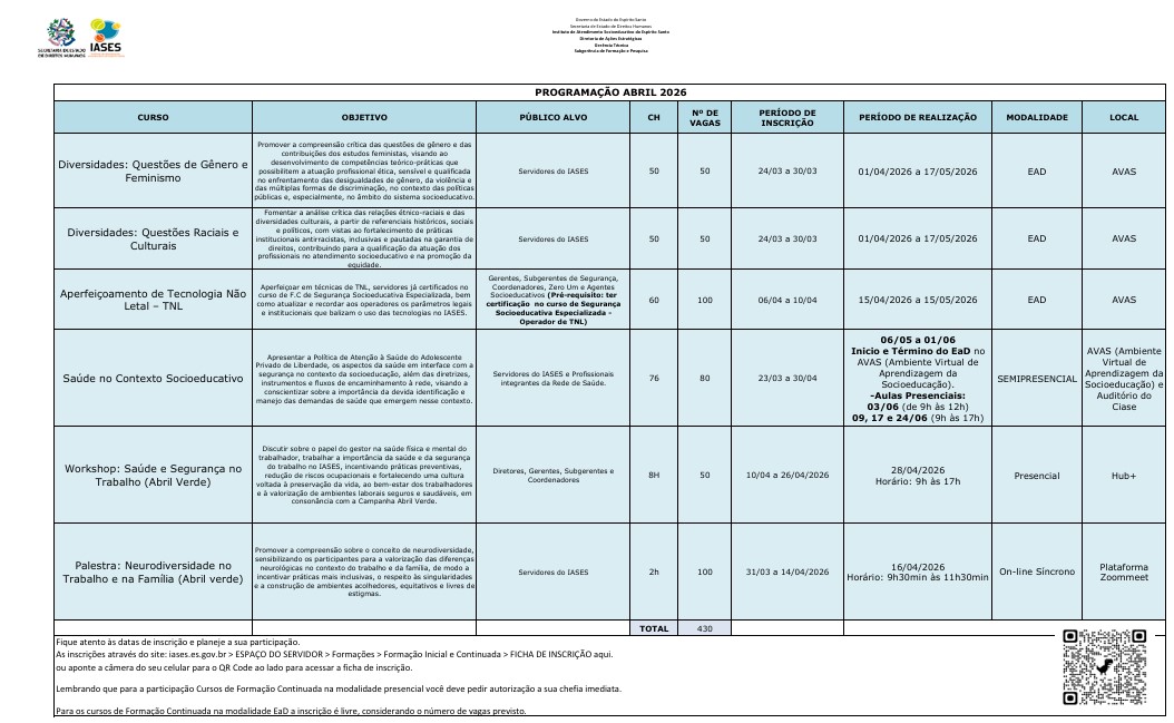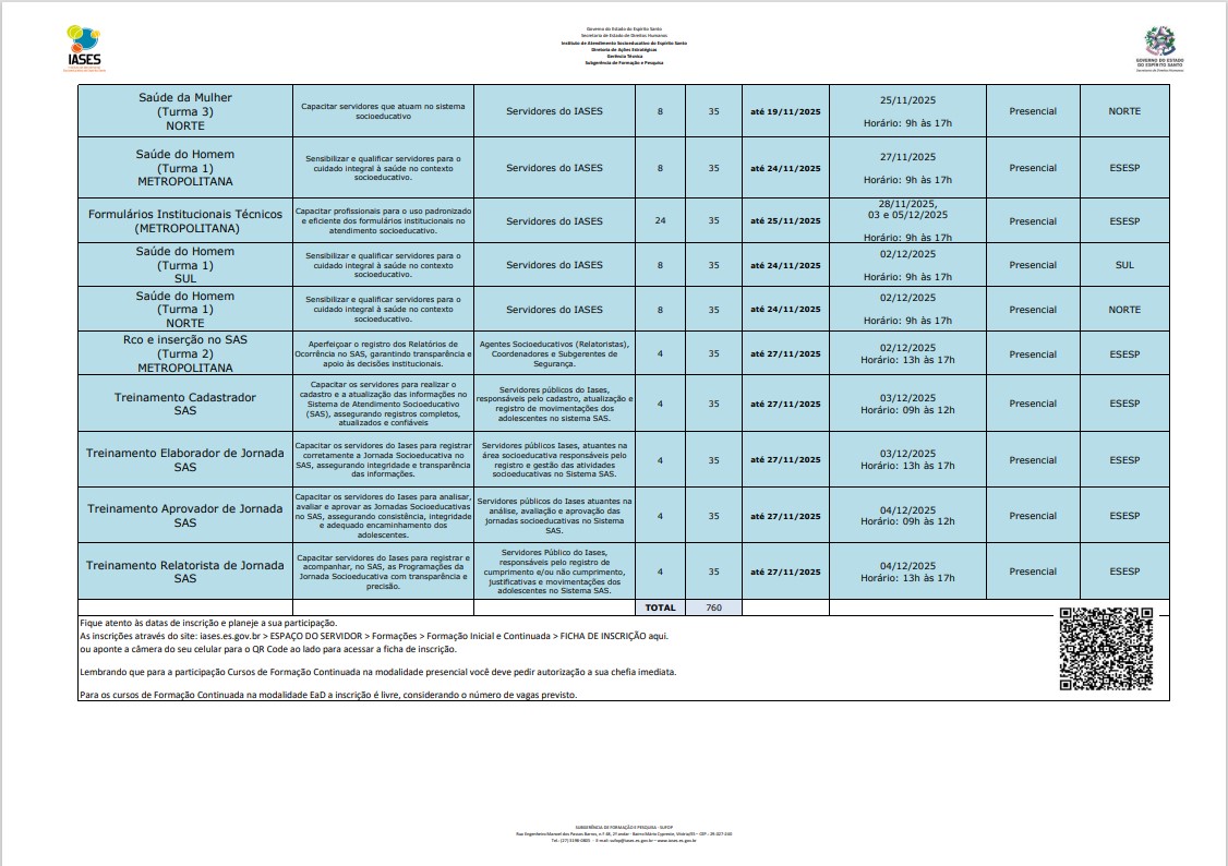 - O servidor que tiver impossibilitado de participar da formação deverá enviar justificativa formal para o e-mail sufop@iases.es.gov.br, em até 48 (quarenta e oito) horas antes do início da formação;